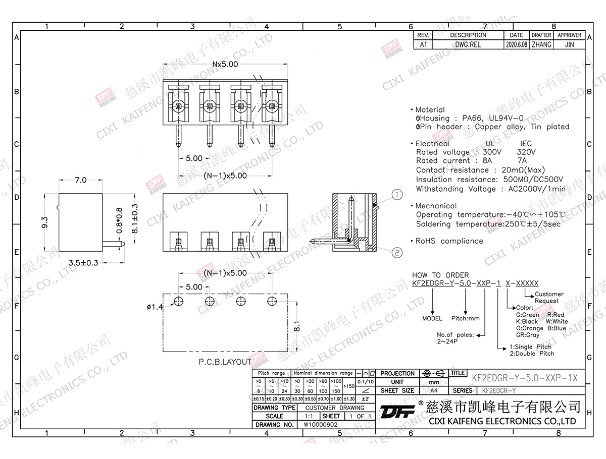 Pluggable Terminal Block MATERIAL:contact: -Pin header: Brass, Tin platedHousing: PA66,UL94V-0ElectricalULIECRated voltage300V 320V Rated current8A7AContact resistance20mΩInsulation resistance500MΩ/DC500VWithstanding voltage AC2000V/1minWire range-MechanicalTemp.rang-40℃~+105℃ Max.soldering+250℃,5secTorque-Strip length-