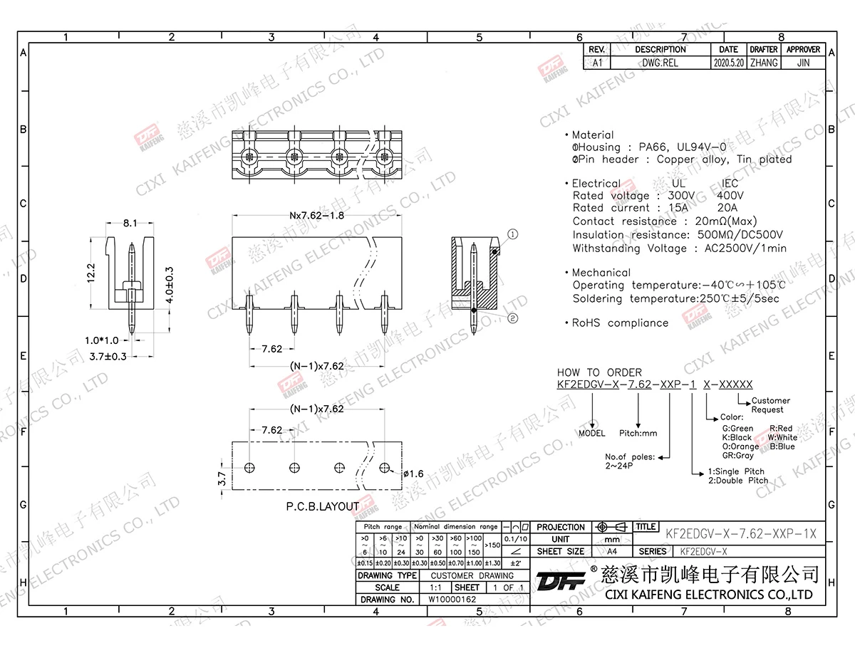 Pluggable Terminal Block MATERIAL:MATERIALScrews: -contact: -Pin header: Brass, Tin platedHousing: PA66,UL94V-0ElectricalULIECRated voltage300V 400V Rated current15A20AContact resistance20mΩInsulation resistance500MΩ/DC500VWithstanding voltage AC2500V/1minWire range-MechanicalTemp.rang-40℃~+105℃ Max.soldering+250℃, 5secTorque-Strip length-