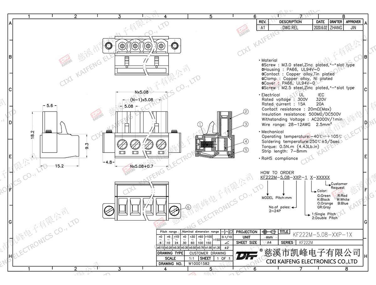 MATERIAL:M2.5,Steel Zinc platedcontact:Phosphor bronzePin header:-Housing:PA66,UL94V-0ElectricalULIECRated voltage300V320VRated current15A10AContact resistance20mΩInsulation resistance500MΩ/DC500VWithstanding voltage AC2000V/1minWire range28-12AWG2.5mm²MechanicalTemp.rang-40℃~+105℃Max.soldering+250℃,5secTorque0.4N.m3.5Lb.inStrip length7-8mm