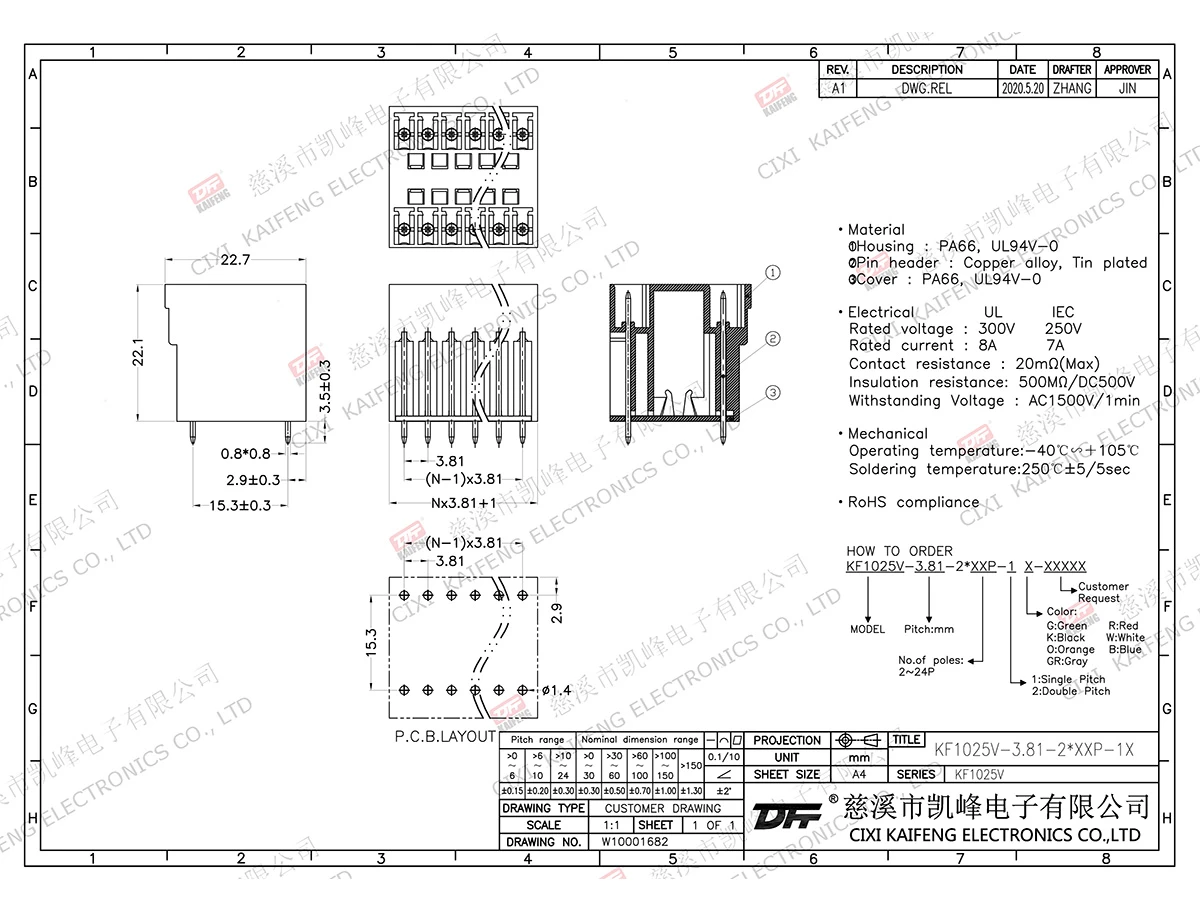 Pluggable Terminal Block MATERIAL:contact: -Pin header: Brass, Tin platedHousing: PA66,UL94V-0ElectricalULIECRated voltage300V 250V Rated current8A7AContact resistance20mΩInsulation resistance500MΩ/DC500VWithstanding voltage AC1500V/1minWire range-MechanicalTemp.rang-40℃~+105℃ Max.soldering+250℃, 5secTorque-Strip length- Make an appointment now