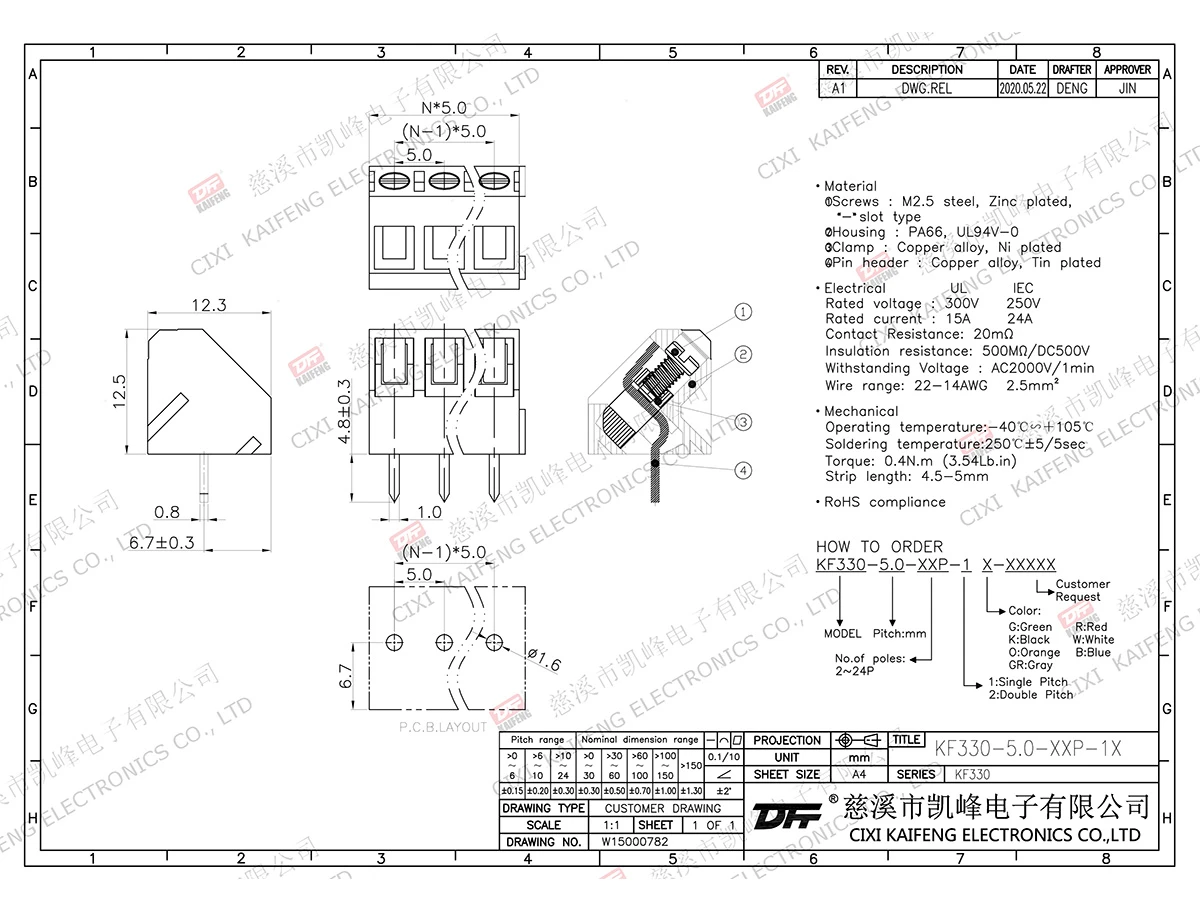 PCB Terminal Block MATERIAL:①Screws : M2.5 Steel Zinc plated,"-"slot type ②Housing : PA66, UL94V-0③Reed :Brass, Tin plated