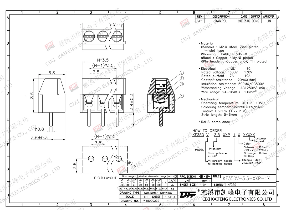 PCB Terminal Block MATERIAL:①Screws : M2.0 Steel Zinc plated,"-"slot type ②Housing : PA66, UL94V-0 ③Reed : Phosphor bronze Ni plated or stainless steel