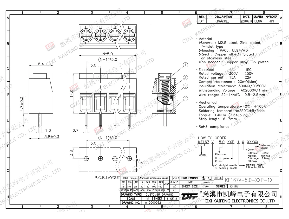 PCB Terminal Block MATERIAL:①Screws : M2.5 Steel Zinc plated,"-"slot type ②Housing : PA66, UL94V-0 ③Reed : Phosphor bronze Ni plated or stainless steel