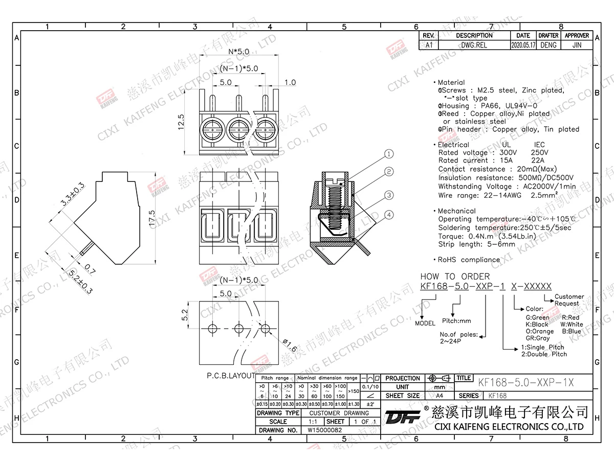 PCB Terminal Block MATERIAL:①Screws : M2.5 Steel Zinc plated,"-"slot type ②Housing : PA66, UL94V-0 ③Reed : Brass, Tin plated ④Pin header