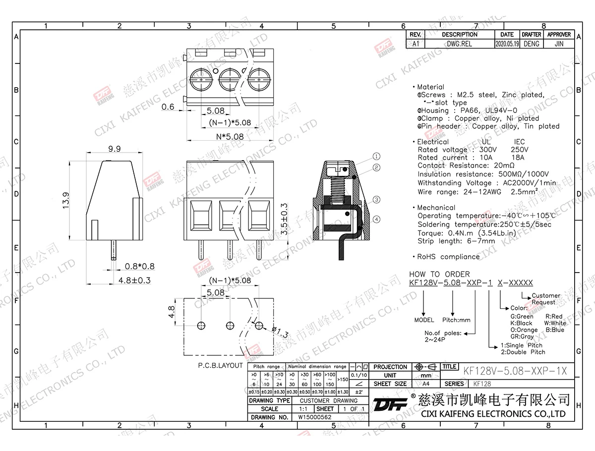 PCB Terminal Block MATERIAL:Screws:M2.5steel,Ni platedContact material:Brass, Tin platedPin header:Brass, Tin platedHousing:PA66UL94V-0·MechanicalTemp.rang:-40°C+105°CMax.soldering:+250°C5 second torque:0.4Nm(3.6lb.in)Strip length:6-7mm·ELECTRICALRated voltage:300VRated current:10AContact resistance:20mΩInsulation resistance:5000MΩ\1000VWithstanding voltage :AC1500V\1MinWire range:24-12AWG2.5mm