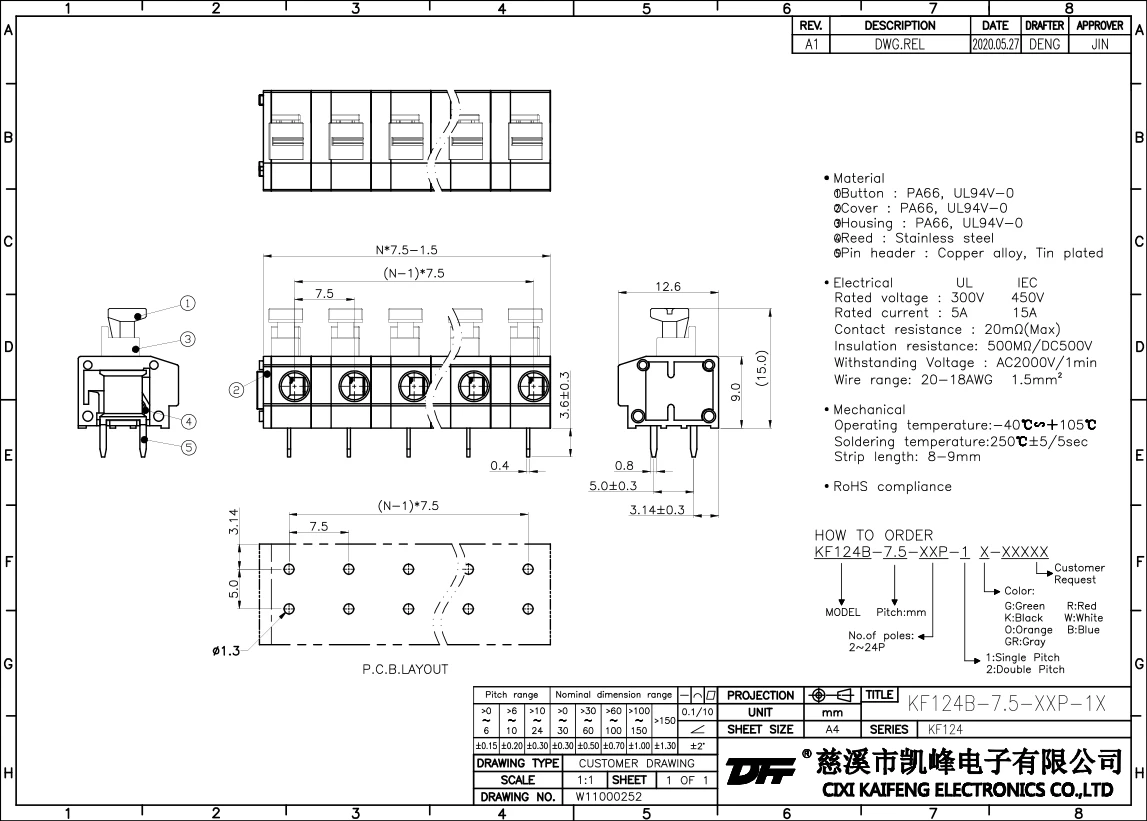 Terminal Material:①Button:PA66,UL94V-0②Cover:PA66,UL94V-0③Button:PA66,UL94V-0④Reed:Stainless steel⑤Pin header:Brass,Tin platedElectricalULIECRated voltage300V 450V Rated current5A 15AContact resistance20mΩInsulation resistance500MΩ/DC500VWithstanding voltage AC2000V/1minWire range20-18AWG 1.5mm²MechanlicalTemp.rang-40℃