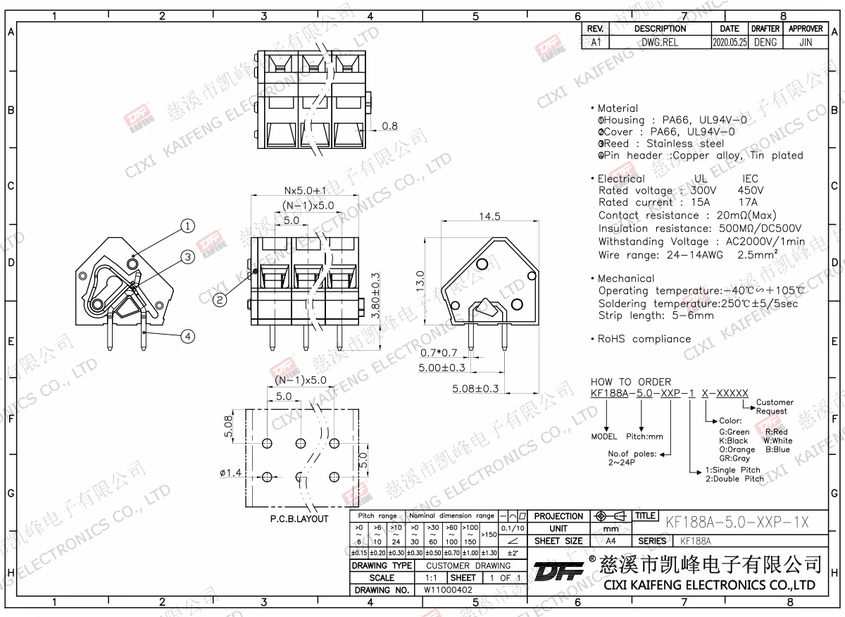 Terminal Material:①Button:PA66,UL94V-0②Cover:PA66,UL94V-0③Reed:Stainless steel④Pin header:Brass,Tin platedElectricalULIECRated voltage300V 450VRated current15A17AContact resistance20mΩInsulation resistance500MΩ/DC500VWithstanding voltage AC2000V/1minWire range24-14AWG 2.5mm²MechanlicalTemp.rang-40℃~+105℃ Max.soldering+250℃,5secTorque