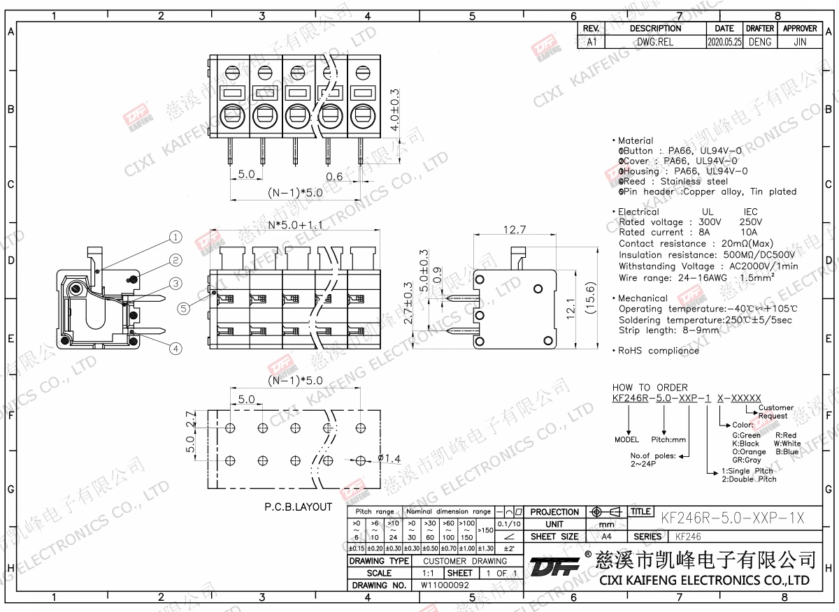 Terminal Material:①Button:PA66,UL94V-0②Cover:PA66,UL94V-0③Button:PA66,UL94V-0④Reed:Stainless steel ⑤Pin header:Brass,Tin platedElectricalULIECRated voltage300V 250VRated current8A10AContact resistance20mΩInsulation resistance500MΩ/DC500VWithstanding voltage AC2000V/1minWire range24-16AWG 1.5mm²MechanlicalTemp.rang-40℃~+105℃
