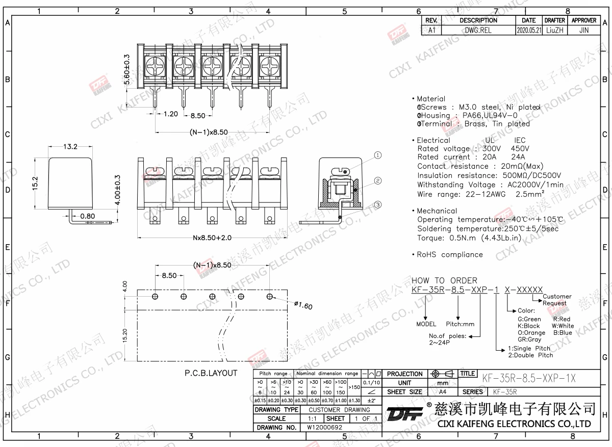Material:M3.0 Steel,Ni platedTerminal:Brass,0.8t Ni platedHousing: PA66,UL94V-0ElectricalULIECRated voltage300V 450V Rated current20A24AInsulation resistance500MΩ/DC500VWithstanding voltage AC2000V/1minWire range22-12AWG 2.5mm²MechanlicalTemp.rang-40℃~+105℃ Torque0.5N.m 4.4Lb.in