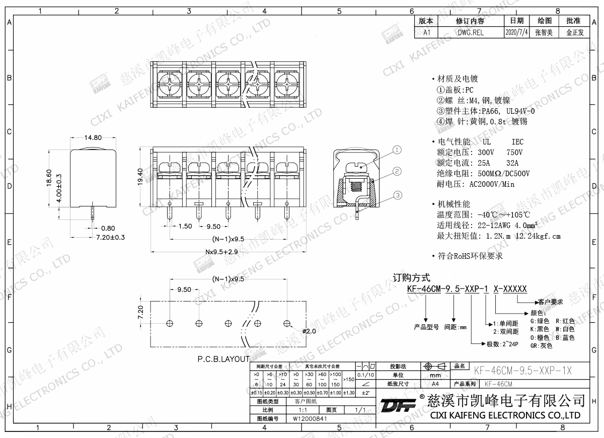 材质电镀:M4.0钢,镀镍端子:黄铜,0.8t镀镍塑件:PA66,UL94V-0电气性能ULIEC额定电压300V750V额定电流25A32A绝缘电阻500MΩ/DC500V耐电压AC2000V/1min使用线径22-12AWG4.0mm²机械性能温度范围-40℃~+105℃扭矩1.2N.m10.53Lb.in