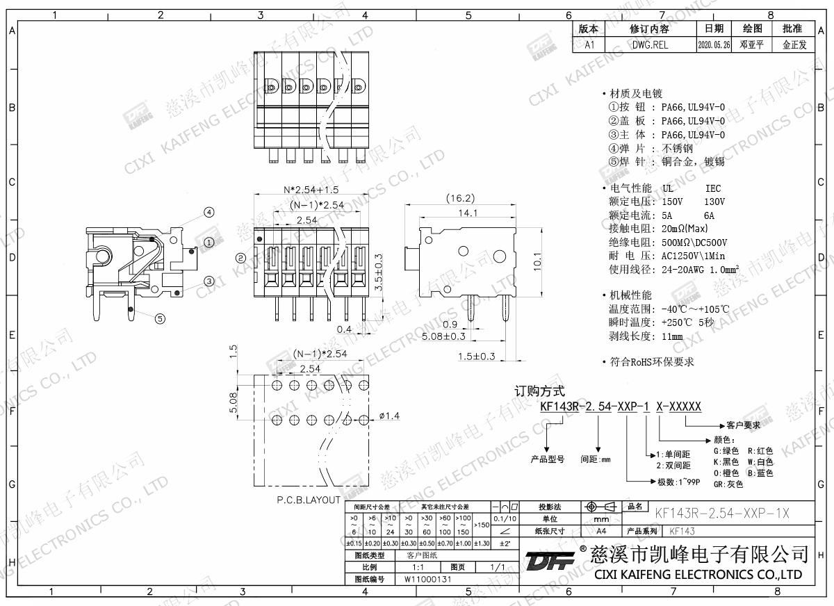 免螺丝式接线端子 材质电镀:①按钮:PA66,UL94V-0②盖板:PA66,UL94V-0③主体:PA66,UL94V-0④弹片:不锈钢⑤焊针:黄铜,镀锡电气性能ULIEC额定电压150V 130V 额定电流5A6A接触电阻20mΩ绝缘电阻500MΩ/DC500V耐电压AC1250V/1min使用线径24-20AWG 1.0mm²机械性能温度范围-40℃~+105℃ 瞬时温度+25