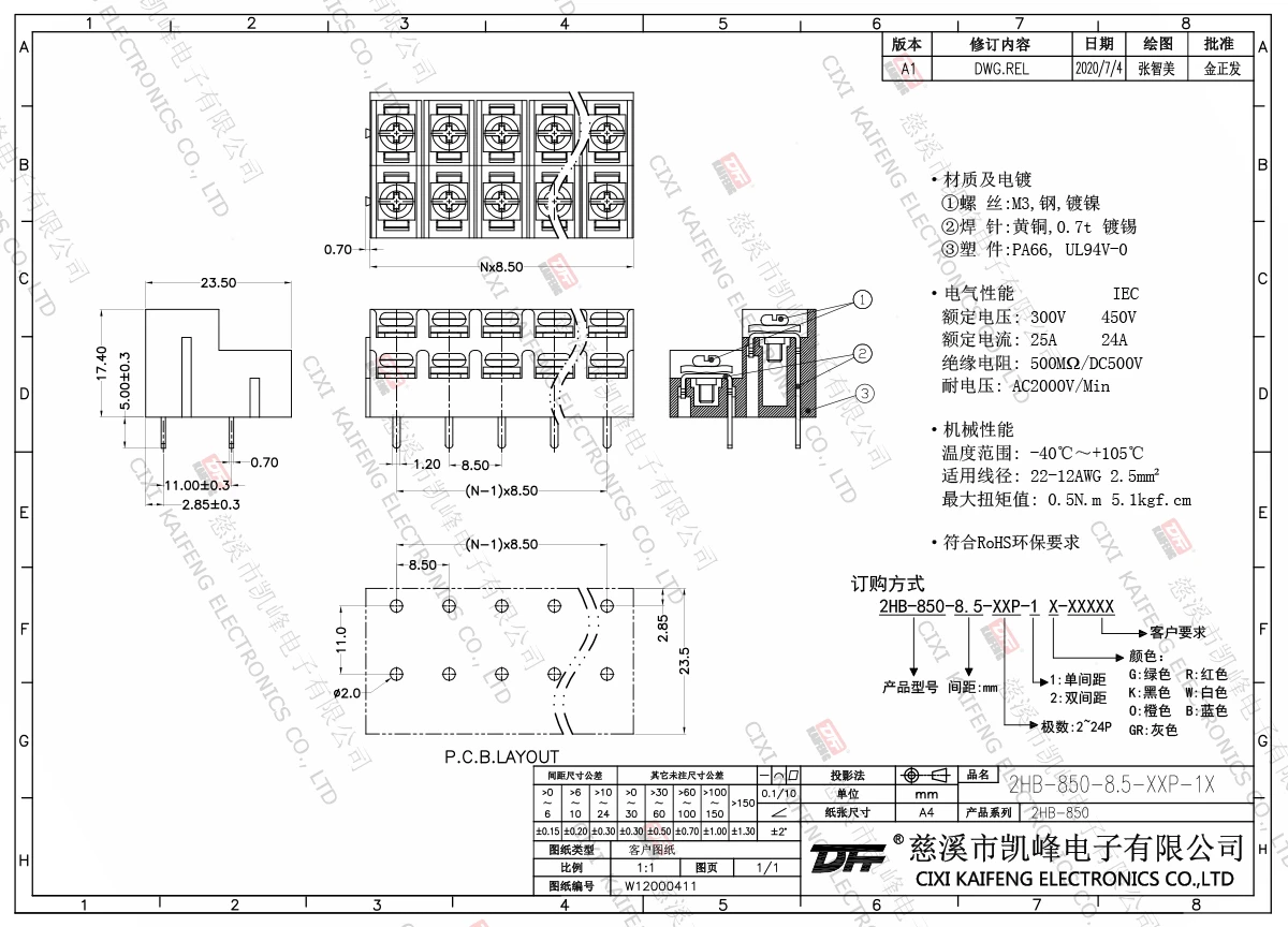 材质电镀:PA66UL94V-0端子:黄铜,0.7厚镀锡螺丝:钢,M3镀镍性能额定电压/电流:300V/20A使用温度:-40℃~+105℃耐电压:AC2000V/Min绝缘阻抗:500MΩ/DC500V适用线径:22~12AWG最大锁紧扭力:0.5N.m4.4Lb.in