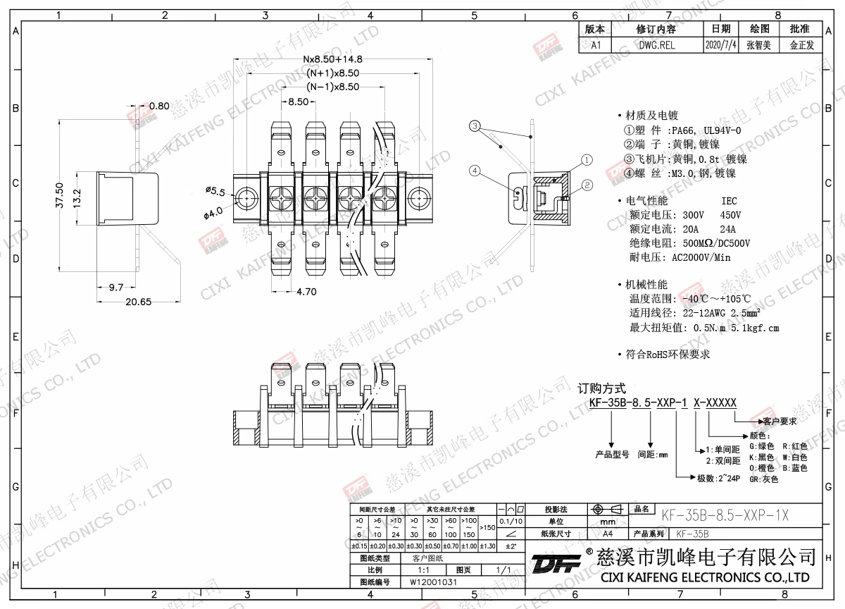 材质电镀:M3.0 钢,镀镍端子:黄铜,0.8t 镀镍塑件: PA66,UL94V-0电气性能ULIEC额定电压300V 450V 额定电流20A24A绝缘电阻500MΩ/DC500V耐电压AC2000V/1min使用线径22-12AWG 2.5mm²机械性能温度范围-40℃~+105℃ 扭矩0.5N.m 4.4Lb.in