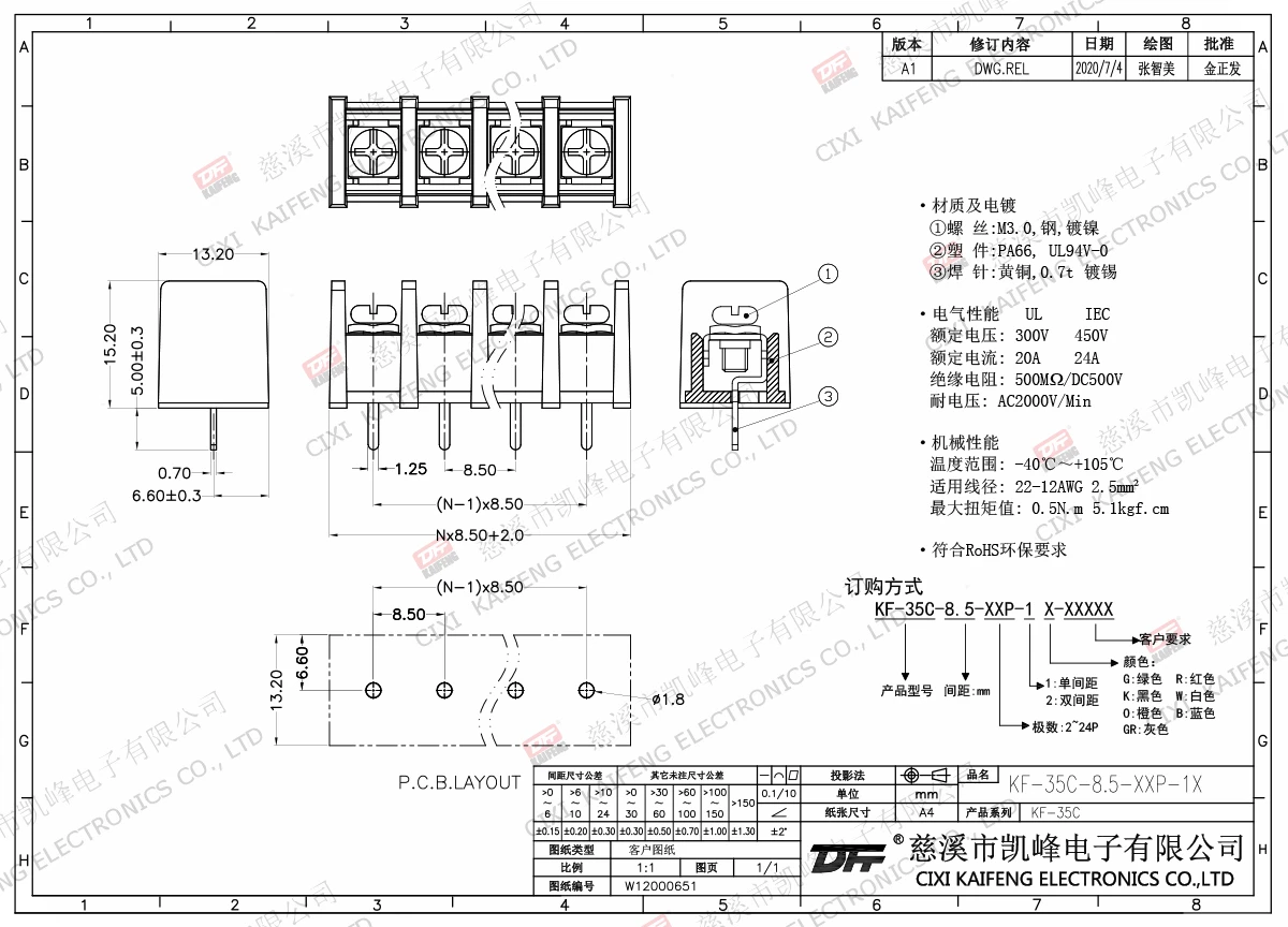 材质电镀:M3.0 钢,镀镍端子:黄铜,0.7t 镀镍塑件: PA66,UL94V-0电气性能ULIEC额定电压300V 450V 额定电流20A24A绝缘电阻500MΩ/DC500V耐电压AC2000V/1min使用线径22-12AWG 2.5mm²机械性能温度范围-40℃~+105℃ 扭矩0.5N.m 4.4Lb.in