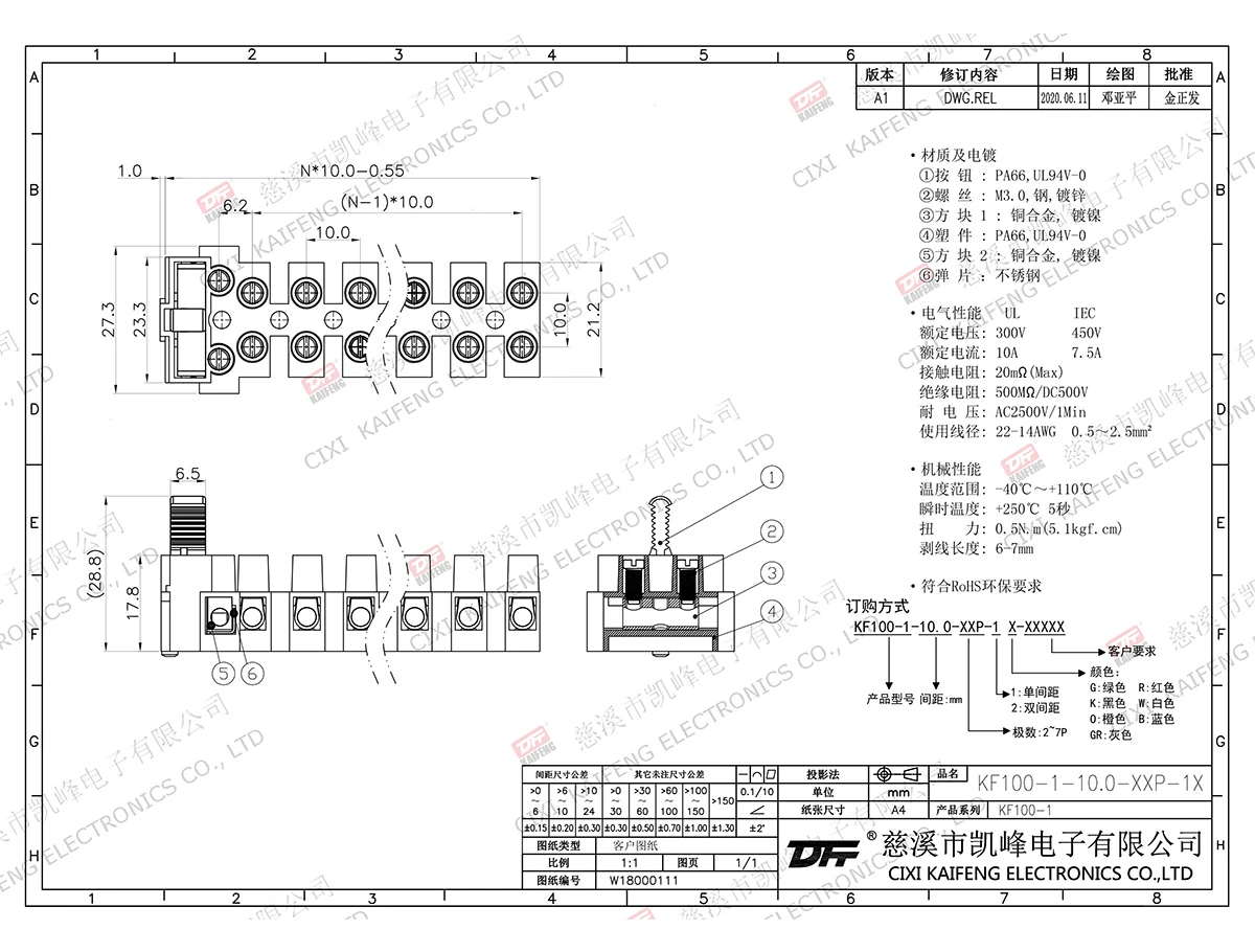 固定式连接端子 材质电镀:螺丝(Screw):M3.0,钢,镀锌 触点:黄铜,镀镍 塑件: PA66, UL94V-0 &n