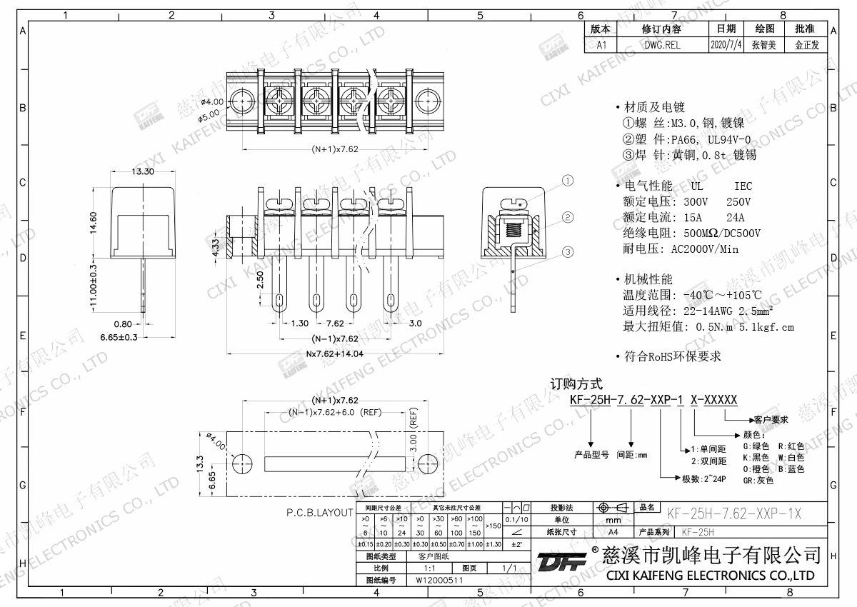 材质电镀:M3.0 钢,镀镍端子:黄铜,0.8t 镀镍塑件: PA66,UL94V-0电气性能ULIEC额定电压300V 250V 额定电流15A24A绝缘电阻500MΩ/DC500V耐电压AC2000V/1min使用线径22-14AWG 2.5mm²机械性能温度范围-40℃~+105℃ 扭矩0.5N.m 4.4Lb.in