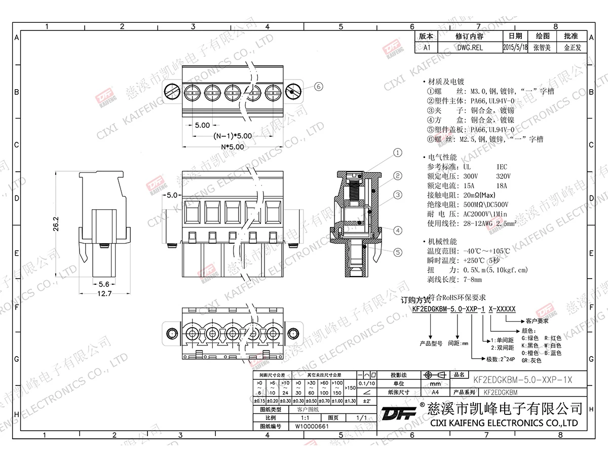 插拔式连接端子 材质电镀:M3.0,钢,镀锌触点: 磷青铜方块: --塑件: PA66,UL94V-0电气性能ULIEC额定电压300V 320V 额定电流15A18A接触电阻20mΩ绝缘电阻500MΩ/DC500V耐电压AC2000V/1min使用线径28-12AWG 2.5mm²机械性能温度范围-40℃~+105℃ 瞬时温度+250℃, 5