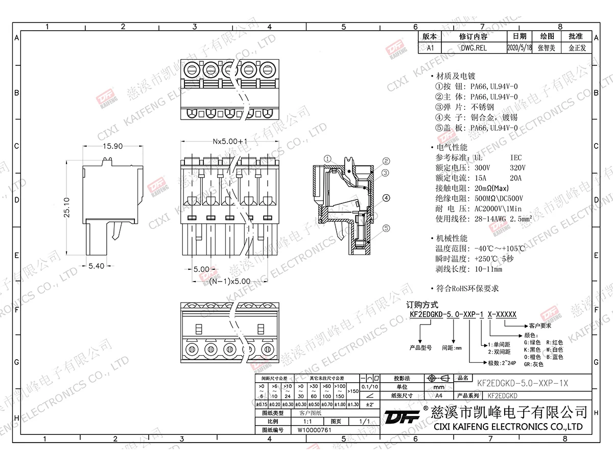 材质电镀:触点: 磷青铜弹片: 不锈钢塑件: PA66,UL94V-0电气性能ULIEC额定电压300V 320V 额定电流15A20A接触电阻20mΩ绝缘电阻500MΩ/DC500V耐电压AC2000V/1min使用线径28-14AWG 2.5mm²机械性能温度范围-40℃~+105℃ 瞬时温度+250℃, 5sec扭矩-剥线长度10