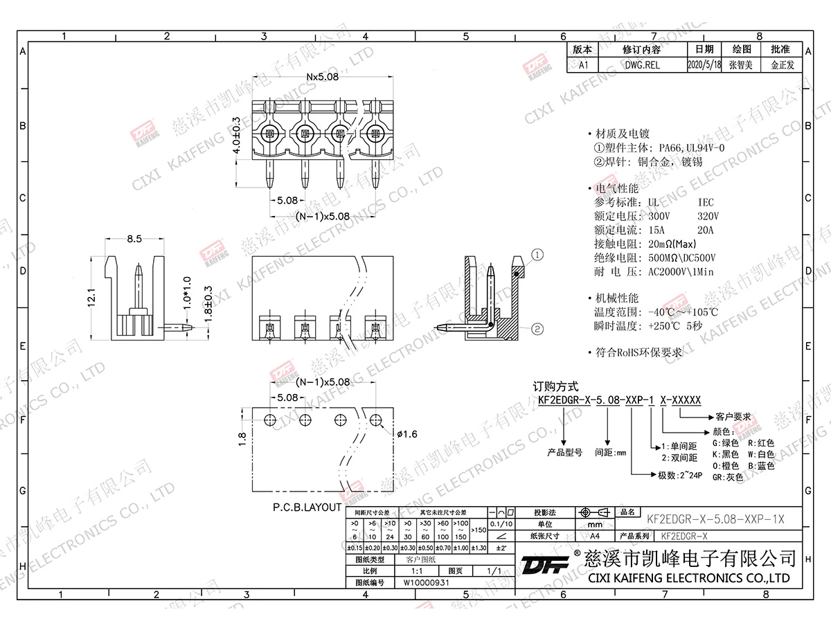 插拔式连接端子 材质电镀:触点: -焊针: 黄铜,镀锡塑件: PA66,UL94V-0电气性能ULIEC额定电压300V 320V 额定电流15A20A接触电阻20mΩ绝缘电阻500MΩ/DC500V耐电压AC2000V/1min使用线径-机械性能温度范围-40℃~+105℃ 瞬时温度+250℃,5sec扭矩-剥线长度-