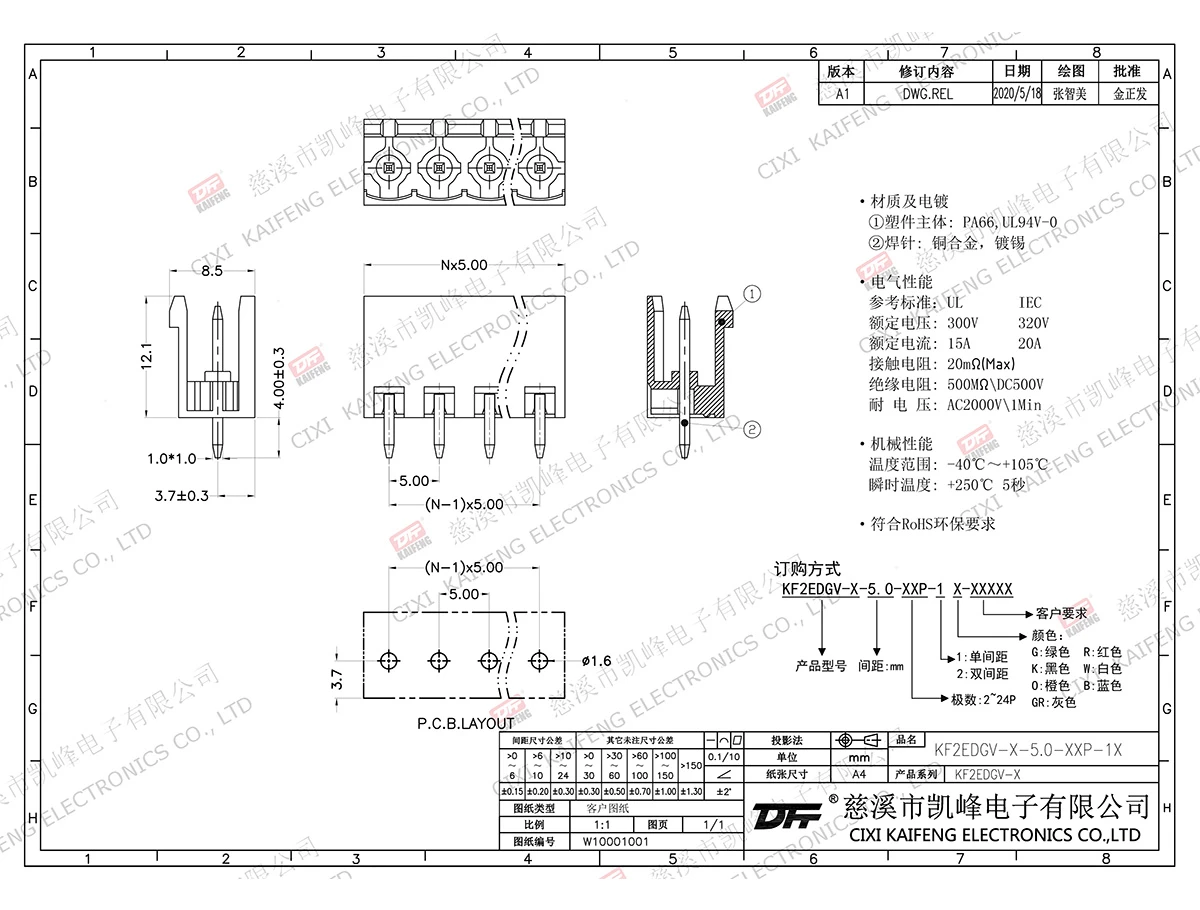插拔式连接端子 材质电镀:触点: -焊针: 黄铜,镀锡塑件: PA66,UL94V-0电气性能ULIEC额定电压300V 320V 额定电流15A20A接触电阻20mΩ绝缘电阻500MΩ/DC500V耐电压AC2000V/1min使用线径-机械性能温度范围-40℃~+105℃ 瞬时温度+250℃,5sec扭矩-剥线长度-