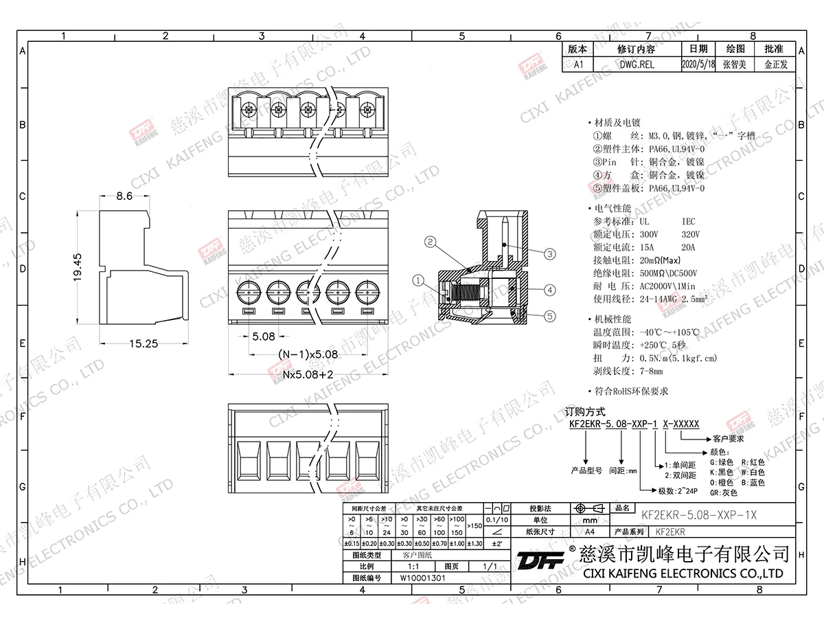 材质电镀:材质及电镀螺丝: M3.0,钢,镀锌触点: 磷青铜焊针: -塑件: PA66,UL94V-0电气性能ULIEC额定电压300V 320V 额定电流15A20A接触电阻20mΩ绝缘电阻500MΩ/DC500V耐电压AC2000V/1min使用线径24-14AWG 2.5mm²机械性能温度范围-40℃~+105℃ 瞬时温度+25