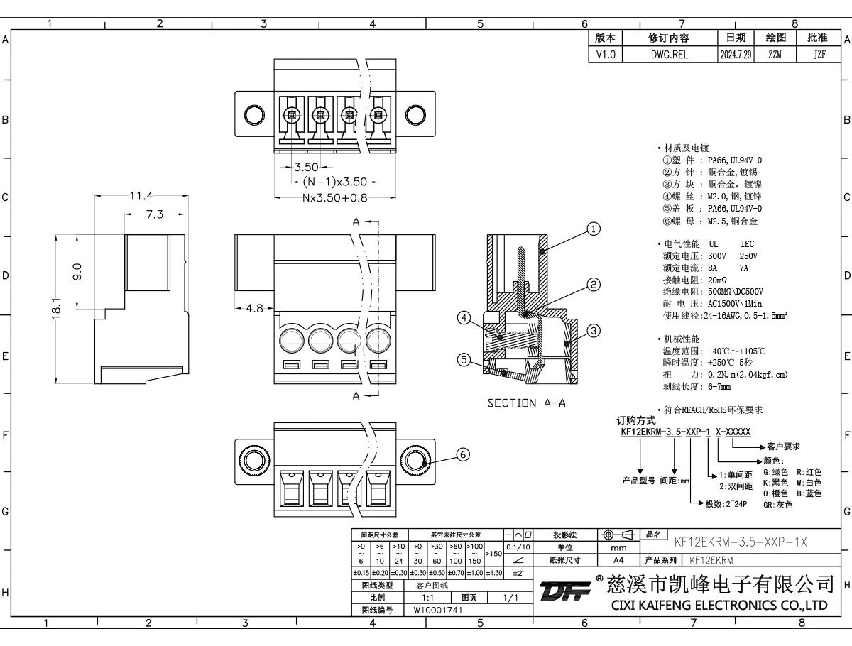 材质电镀:M2.5,钢,镀锌夹子:磷青铜,镀镍触点:黄铜,镀镍塑件:PA66,UL94V-0电气性能ULIEC额定电压300V250V额定电流8A7A接触电阻20mΩ绝缘电阻500MΩ/DC500V耐电压AC1500V/1min使用线径26-28AWG0.5-1.5mm²机械性能温度范围-40℃~+105℃瞬时温度+250℃,5sec扭矩0.2N.m2.4kgf.cm剥线长度6-7mm
